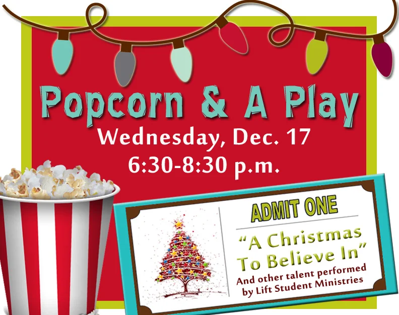 Support Lift Student Ministries and enter into the spirit of Christmas with Popcorn & A Play. The Lift Drama Team will be performing the play, "A Christmas To Believe In" and several youth will include talent performances as well.