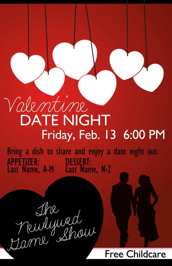 Who needs a date night? Grab your spouse and join us on the eve of Valentine's Day for a fun, romantic night out. Appetizers & desserts will be served & free childcare will be provided.