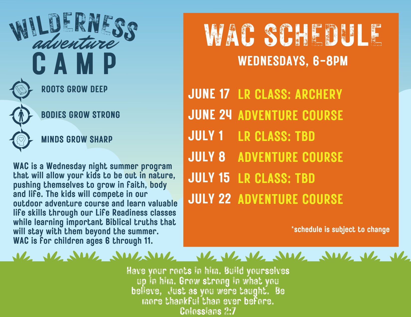 WAC is a Wednesday night summer program that will allow your kids to be out in nature, pushing themselves to grow in faith, body and life. The kids will compete in our outdoor adventure course and learn valuable life skills through our Life Readiness classes while learning important Biblical truths that will stay with them beyond the summer.
